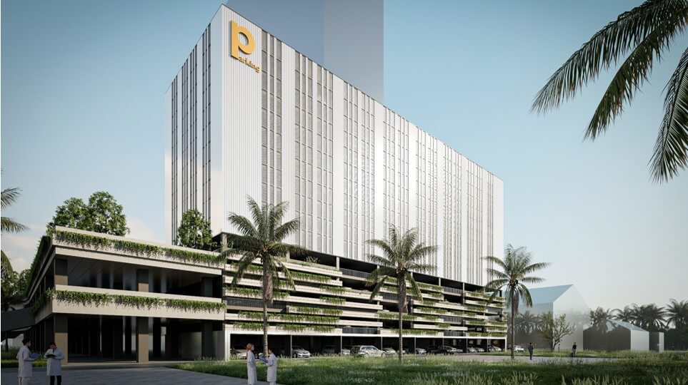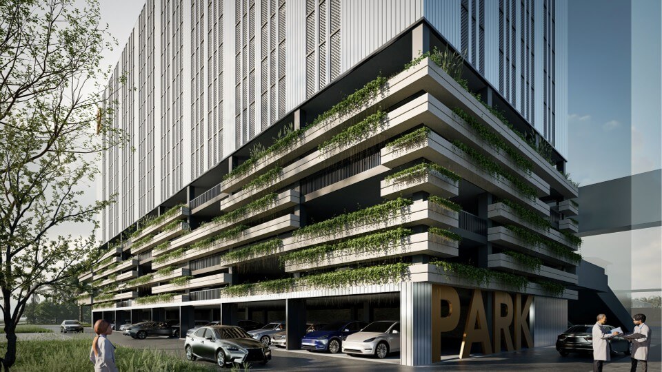 The parking building is connected to the existing building of the hospital. Borrowing a 2-story platform as the exit for the mechanical garage can not only avoid vehicle congestion on the first floor, but also improve usage efficiency.