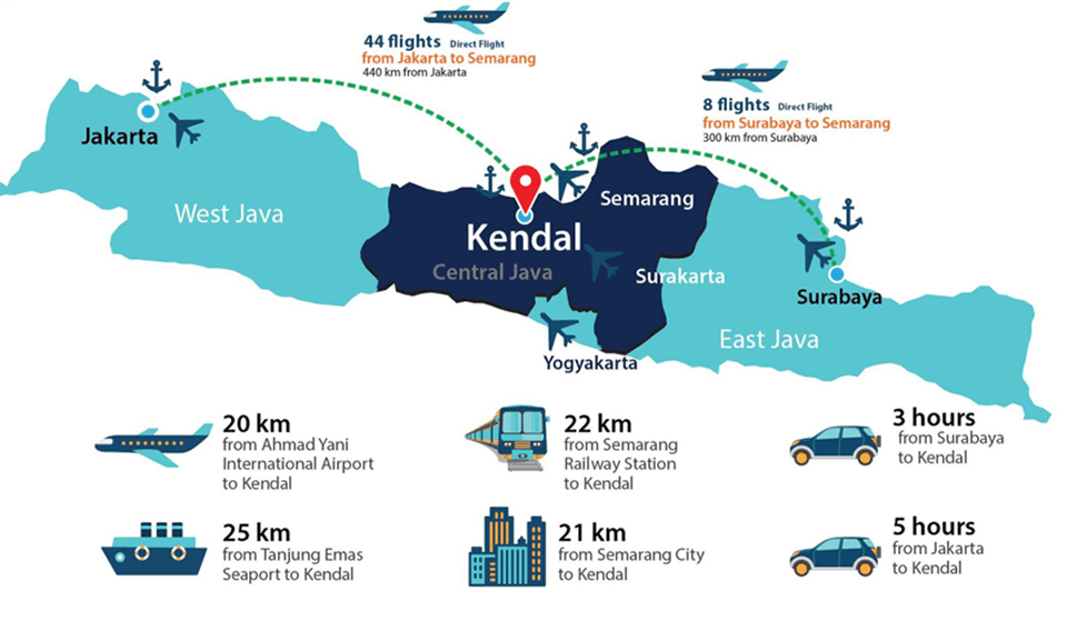 Located 21 km from Semarang city center and 5 hours by land from Jakarta;Airport access: 20 km from Semarang International Airport;Deep-water port access: 25 km from the existing deep-water port; a 150,000-ton deep-water port is scheduled to commence operations in 2025, expected to be completed in 2026.