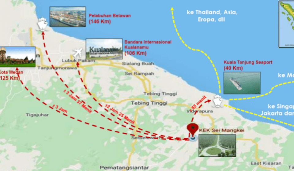 Located 144 km from Medan city center, with planned highways connecting to the existing expressways requiring 3–4 years for construction;